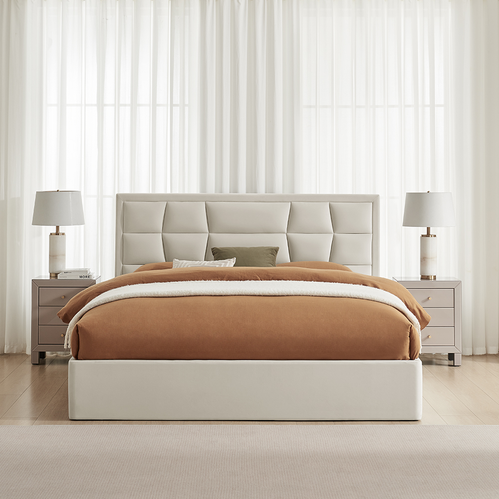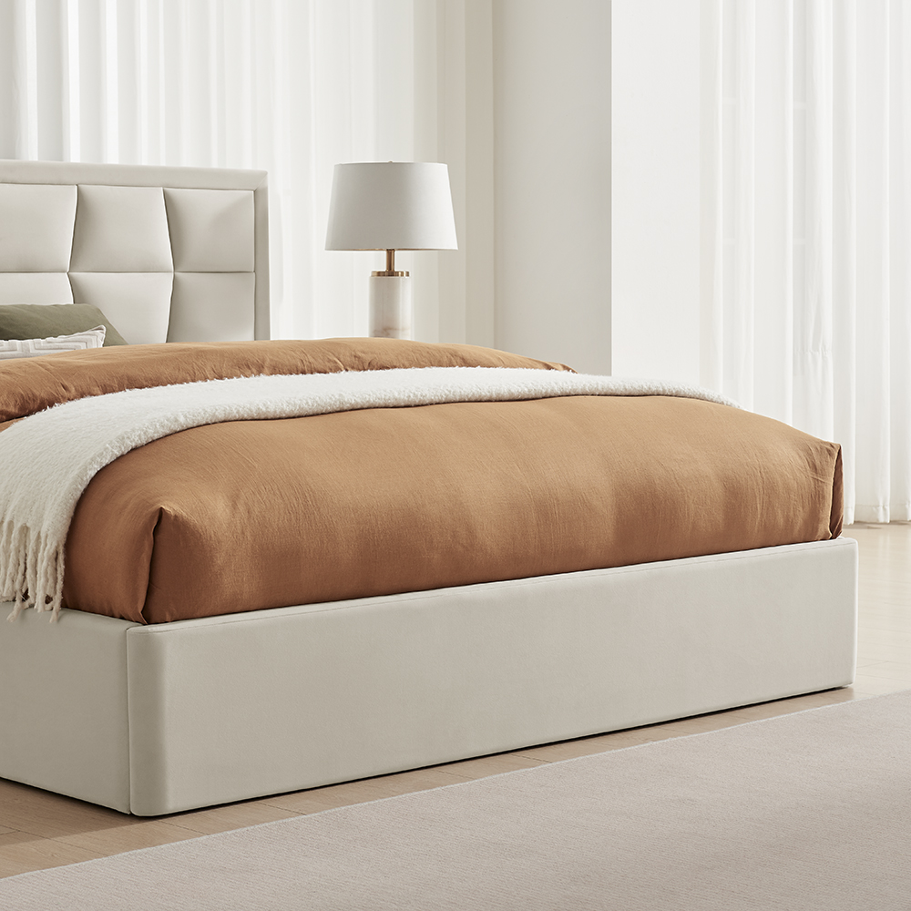 A geometric design that brings modern style from retro inspiration finished in a luxurious velvet made from a 100% Recycled Low Carbon fabric. This model incorporates a smart under-bed storage solution - perfect for maximising space without compromising style. The use of recycled bottles in its construction means the bed has a reduced carbon footprint and has helped to minimise plastic waste.