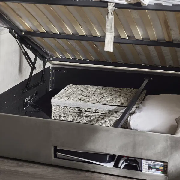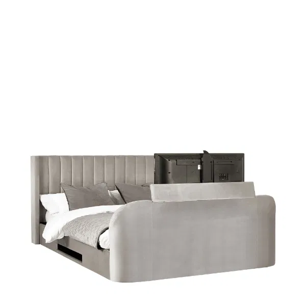 Upgrade your bedroom with the Klara Ottoman TV Bed, where comfort meets modern convenience. Upholstered in soft light grey fabric, this bed features a sleek, paneled design that complements any decor. The side-lift ottoman provides easy access to generous storage, and the included drawer offers even more space to store your essentials. With a convenient remote control, effortlessly raise and lower the bed to accommodate a 43-inch TV, transforming your space into an entertainment haven. Minimal assembly is required, allowing you to quickly enjoy both style and functionality.