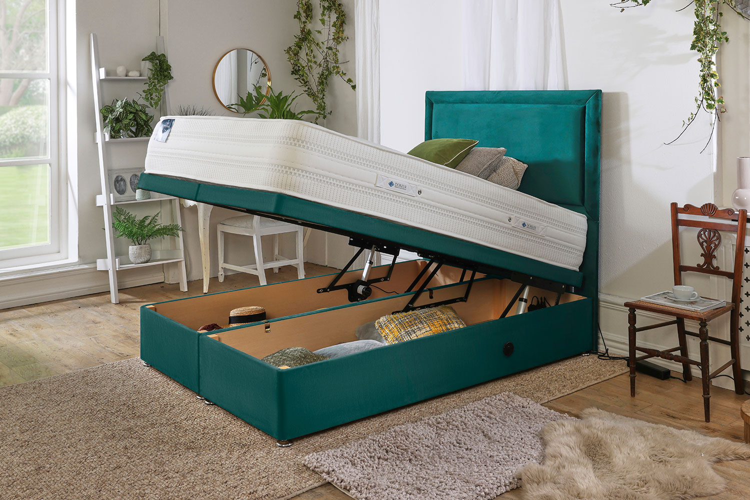 This sturdy base combines classic design with modern technology to give you the best storage option for your bedroom. It features a mains-powered motor that lifts the lid smoothly in a convenient and effortless movement. The wireless remote control allows for fuss-free operation of the mechanism, allowing you to access your stored belongings at the touch of a button. A USB charging port is integrated into the base, enabling access to charge mobile phones and other electronic devices while keeping them close at hand. The additional manual mechanism means the ottoman can be operated even in the absence of the remote control. The motor and wiring tuck away inside the storage compartment to further elevate the look and atmosphere of your home. The electric ottoman is available in a range of fabrics and colours to complement your décor. Matching headboards are also available in a range of designs.